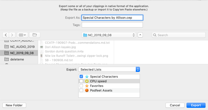 I exported my Special Characters list and put a link in the show notes in case anyone wants to import it into their version of Copy’em Paste. Oh and I’d named the file with space in it, but fixed that using Copy’em Paste before uploading so the url wouldn’t look dumb!