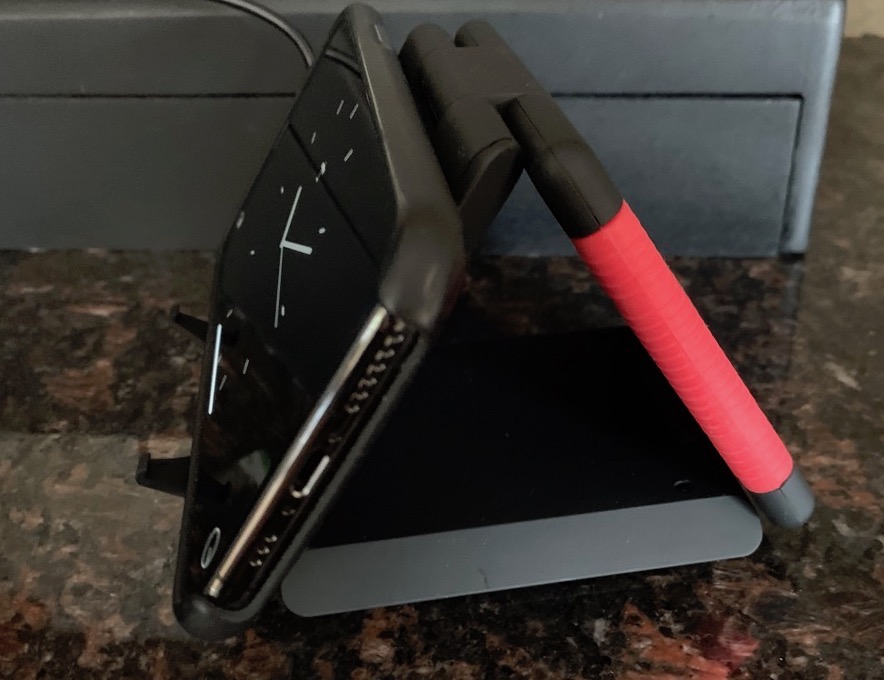 I mentioned in the very beginning that you can lay Unravel flat on a table, but you can also fold it up into a triangle. When you do this, the side with the watch charger and one other side have a little flip out thingy that lets you stand up your phone. If you have it in portrait mode Unravel doesn’t come up far enough on the iPhone XS to engage the Qi charging. It might on another type of phone though.