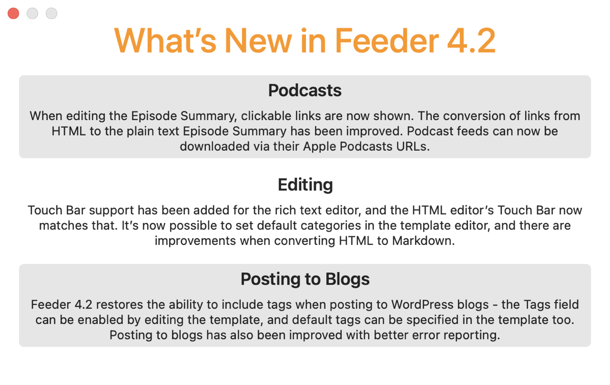 Today there are many ways to create this file. There are WordPress plugins that will create it, and the podcast hosting services Libsyn and Blubrry will both create it for you if you like. Instead, I choose to use an application for the Mac called Feeder from Reinvented Software to create my feed. It’s a terrific text editor, it automates adding the album artwork, and I’ve recently begun to trust it to send my audio files to my server. It’s been able to do that for ages but I was afraid to try it until recently.