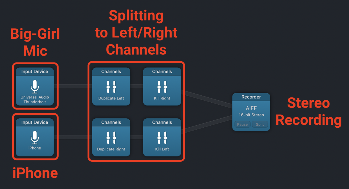 I could have held the iPhone up to my microphone, but it would have sounded awful. I needed to be able to digitally capture the audio from the iPhone, while also recording my voice and recording video of the iPhone’s screen.