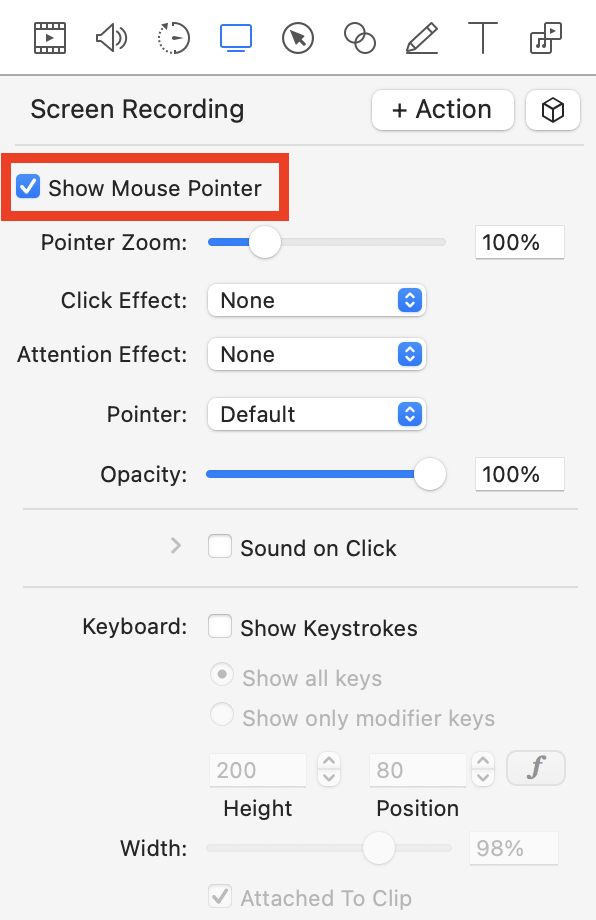 If you do end up with a cut where the cursor is going to jump, in ScreenFlow there’s a cool trick that I learned from J.F. Brissette. Recordings of the screen hold certain visual items on separate layers, and the cursor is alone on one of those layers. ScreenFlow has an action to actually hide the cursor layer.
