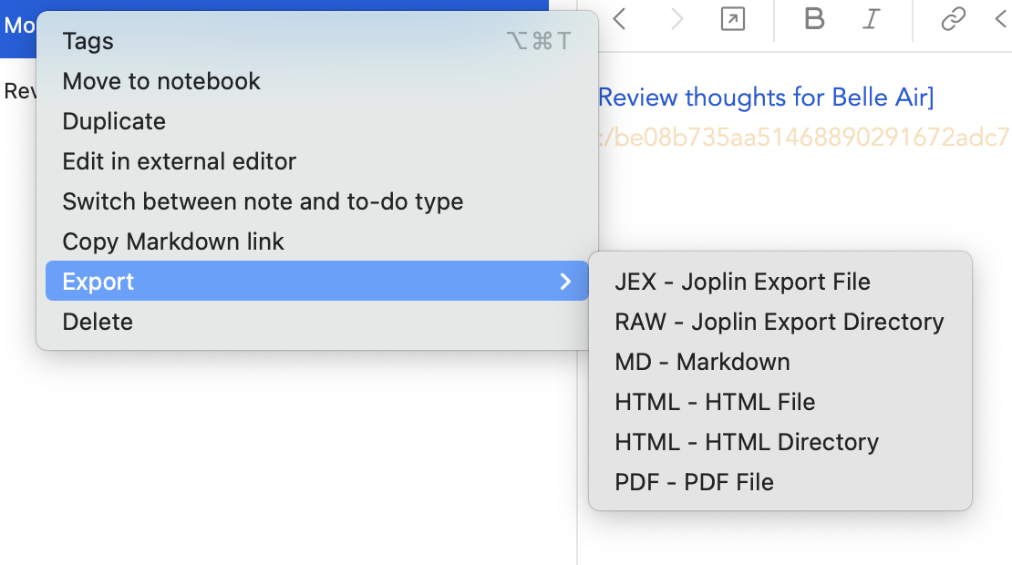 Luckily, Joplin has quite a few options on the export front. You can export notes to: