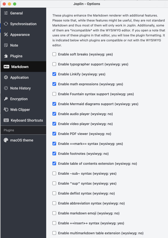 There’s one that will add a powerful calculator and one that will run calculations on your tables in Markdown. If you want Joplin to be skinned to look more like a native Mac app, there’s a theme plugin to do just that. It’s really worth taking a look at all of these third-party plugins to see if there’s something that would make Joplin even more useful to you.