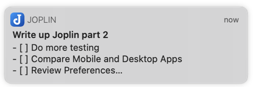Joplin lets you create links between notes. Select a note, right-click on the title and choose Copy Markdown Link. You can then embed that link into any other note for quick access. People in the forums describe using this technique to create their own index of notes on a topic. I think links to other notes would be really useful in a to-do item as well. I normally end up typing a lot of info into a to-do so I remember why I’m doing it, but if I could just link to a note I’d already written on the topic that would be way simpler.