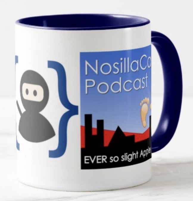 If you’re a huge fan of the Podfeet Podcasts, I bet you’d like a fancy coffee mug with logos of the NosillaCast, Chit Chat Across the Pond and Programming By Stealth on it. Steve designed just such a mug for you and it’s absolutely gorgeous. The inside of the mug is a dark, rich blue and the handle and rim match that fabulous blue. If you’re not a blue person, you can change it to 9 other colors. The red is another great option to complement the NosillaCast logo.