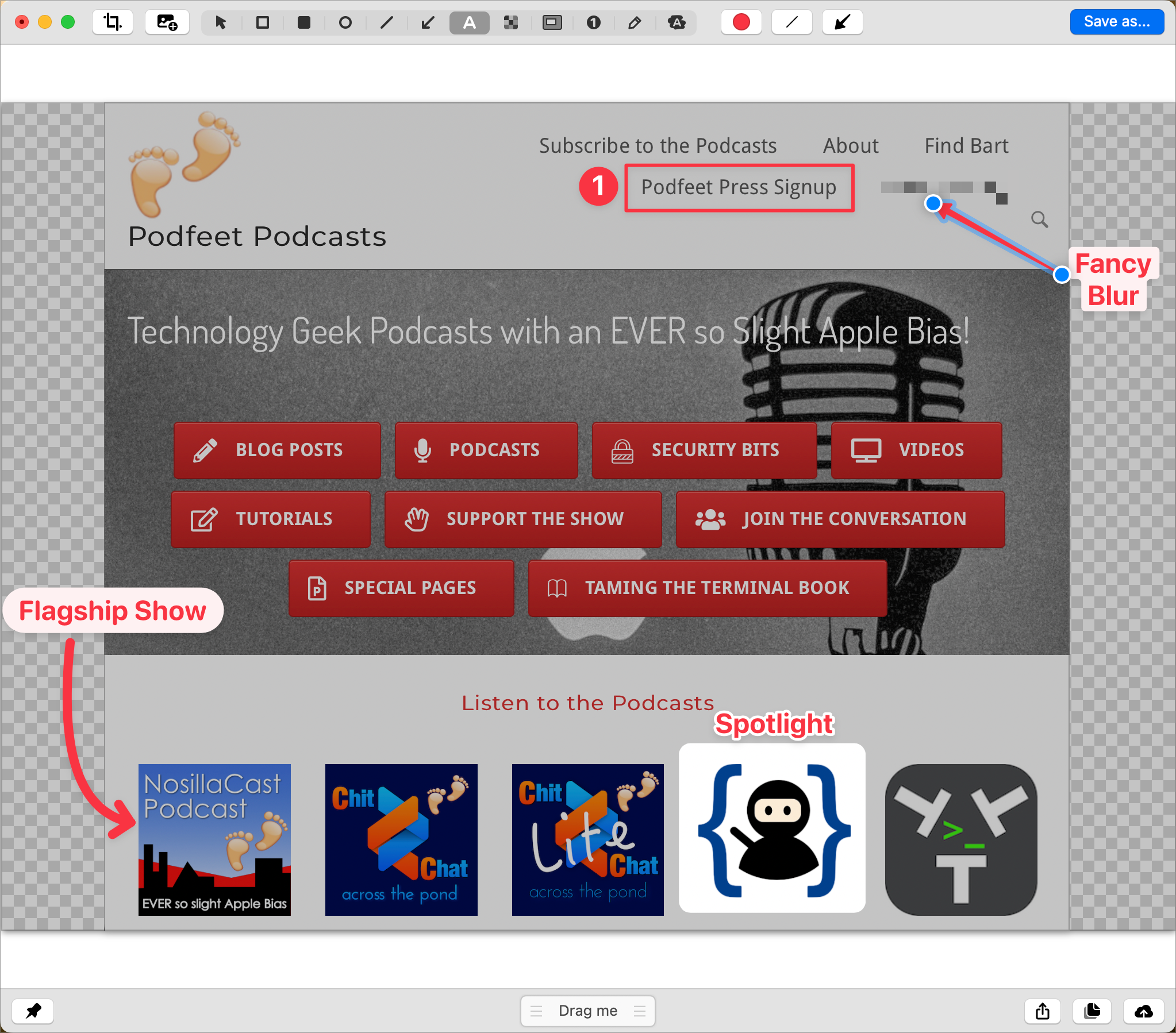 In the intro, I explained that the markup tools in Preview lack a blur tool for obfuscating personal or distracting parts of your screenshots. CleanShot X has you covered with a simple and easy-to-use blur tool. Just drag across a region and then move it around or resize as needed.