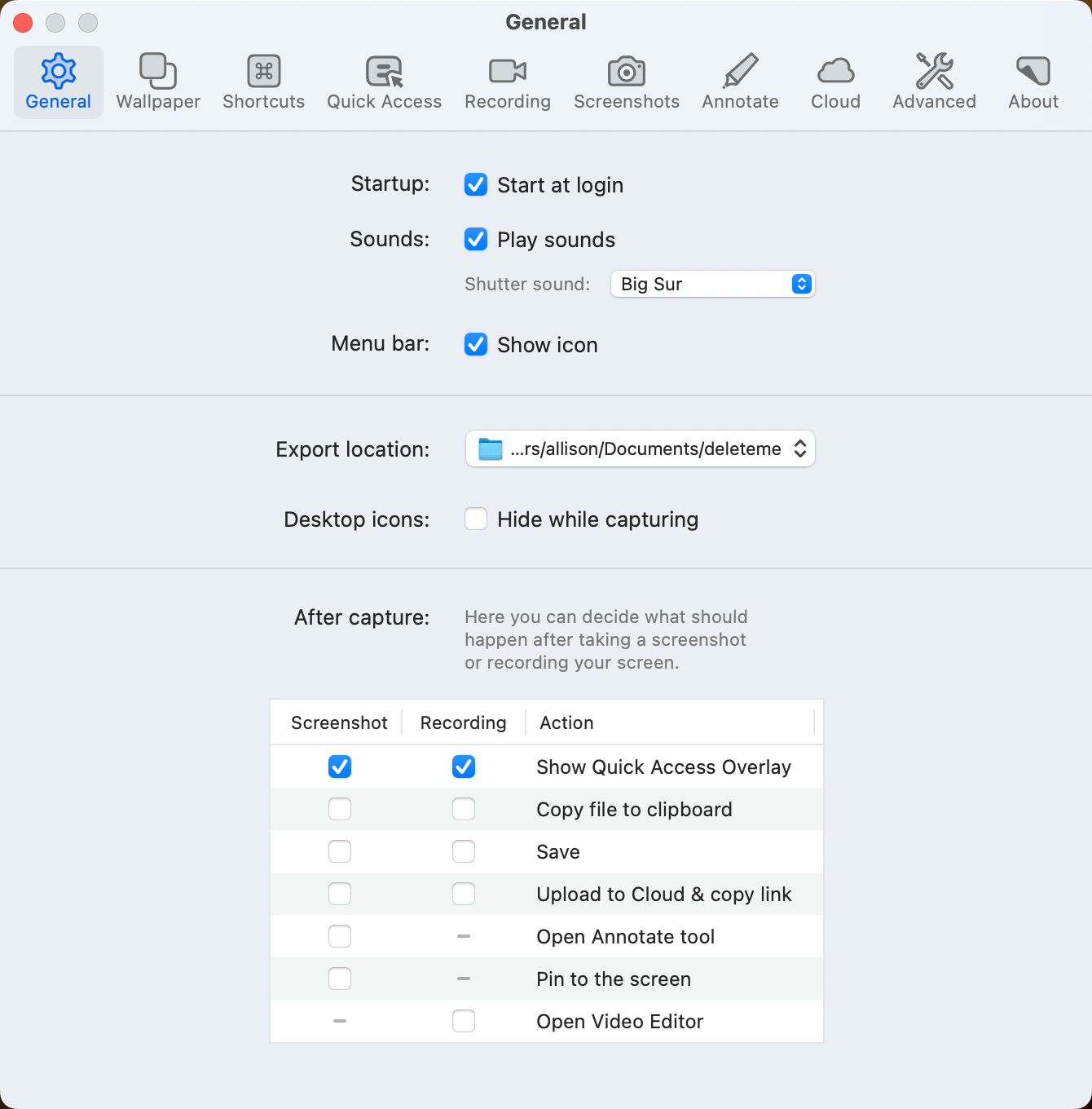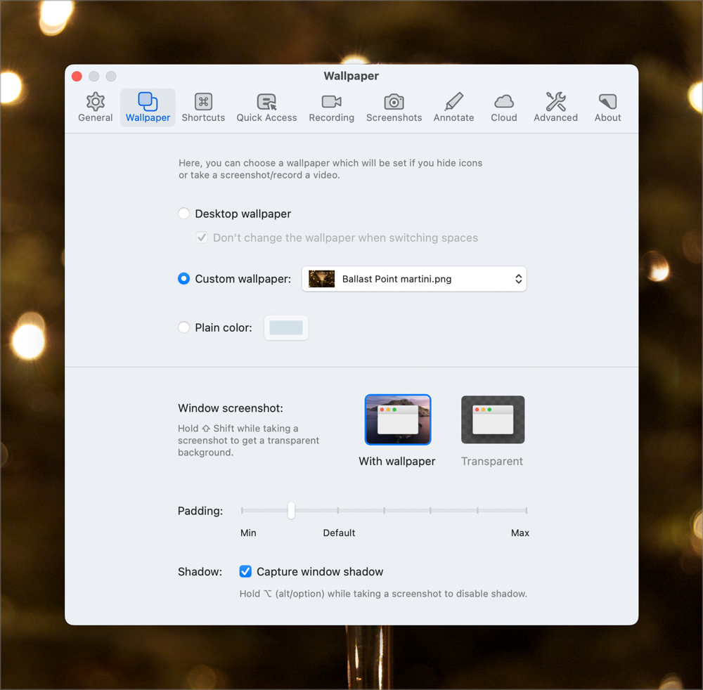 If you’re a messy desktop icon person, in General Preferences you can check the box to hide desktop icons while capturing. Another option to class up your screenshots is to have a drop shadow with a professional-looking desktop background (instead of the cute one of your puppy). These options are available in the Wallpaper tab of Preferences. Toggling this setting means no more looking for that pesky defaults write command to disable and enable the default shadows for the built in tool.