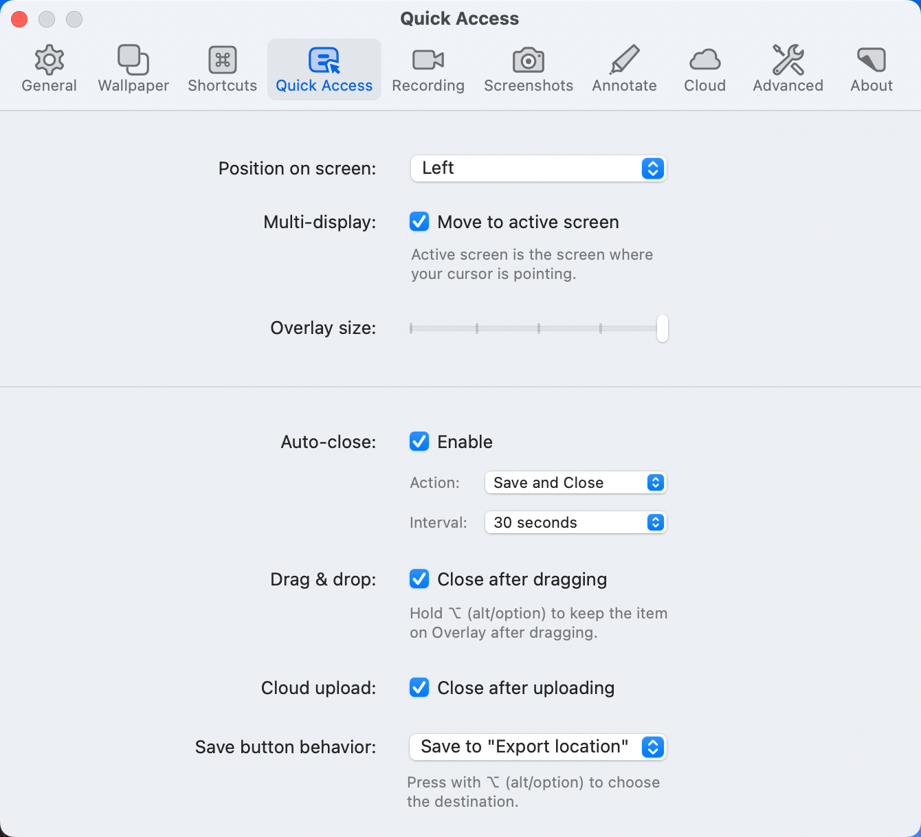 Back to the Quick Access Overlay. While the Overlay has all the options you might want, it’s somehow not satisfying to me to see such a small thumbnail of the image I’ve captured. The first thing I did in the General Preferences for CleanShot X was to check the box to automatically open the Annotate tool when I take a screenshot, instead of the Quick Access Overlay. That toggle was what gives me the behavior I described earlier.