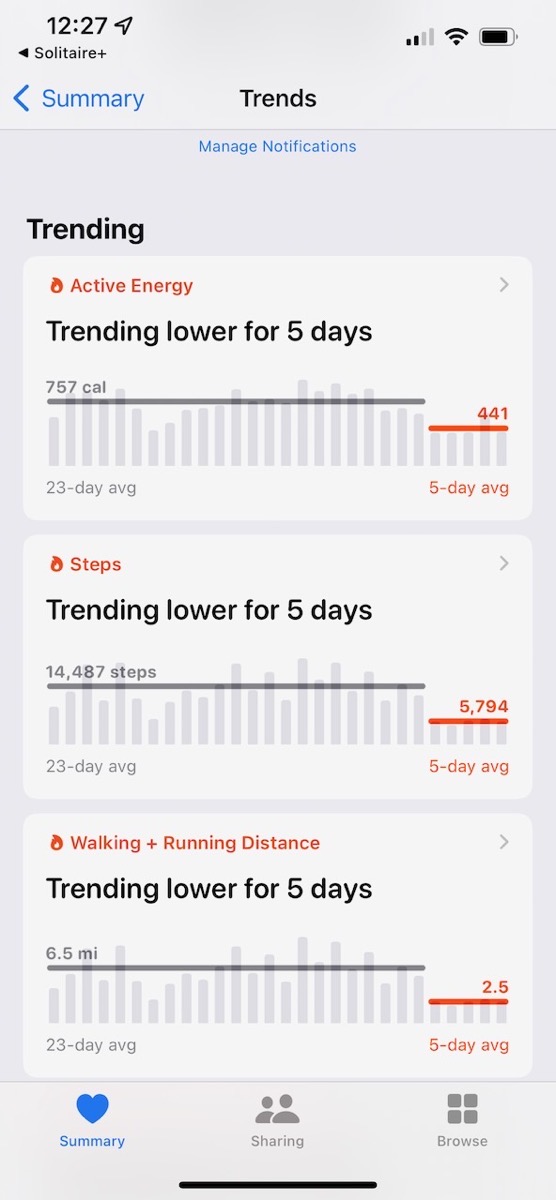 - Activity is very concerned about me. It’s been sending me notifications, and then today it made me go look at Health because all of my numbers were way down. At noon today while I was talking to Bart, I noticed I’d burned 141 calories so far. I almost always overachieve my goal of 680 for the day!