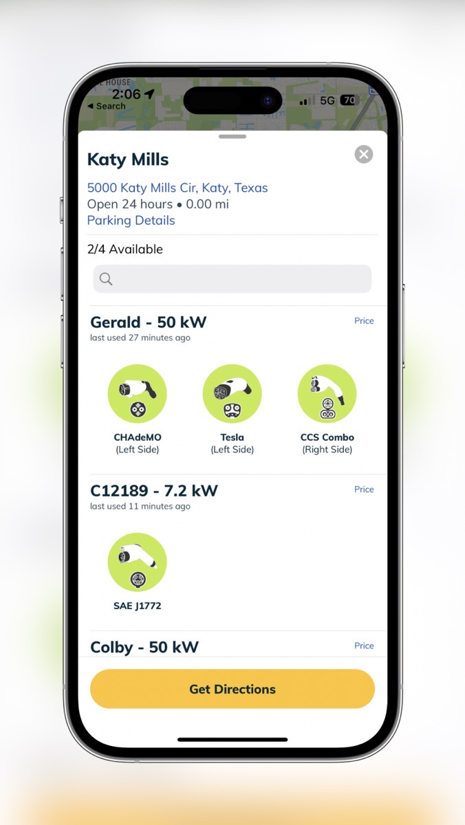 The nice support woman told me to look for example under Gerald’s name on the app, and I should see 3 connector types – Tesla, CCS, and the phased-out CHAdeMO standard. Evidently, we were supposed to tap on the one we needed under the name of the charger we had chosen.