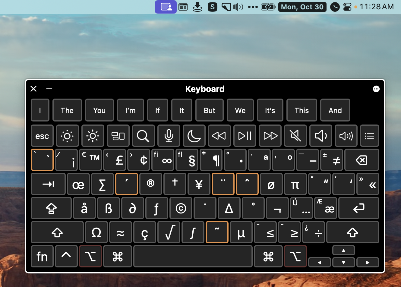 When you open the Keyboard Viewer, you can hold down modifier keys (like the Option key) and see what the different keys will type. In the screenshot I put in the shownotes, I held down the Option key (and you can see it is slightly highlighted in red). Since the Option key is held down, you can see ≤, ≥, ÷, …, and ≠ have replaced their normal keys. As soon as I hold down a modifier key while looking at the Keyboard Viewer, I can’t seem to remember which key is showing the character I want, so I just toggle the modifier key on and off until I can remember the key combination to get my desired punctuation.