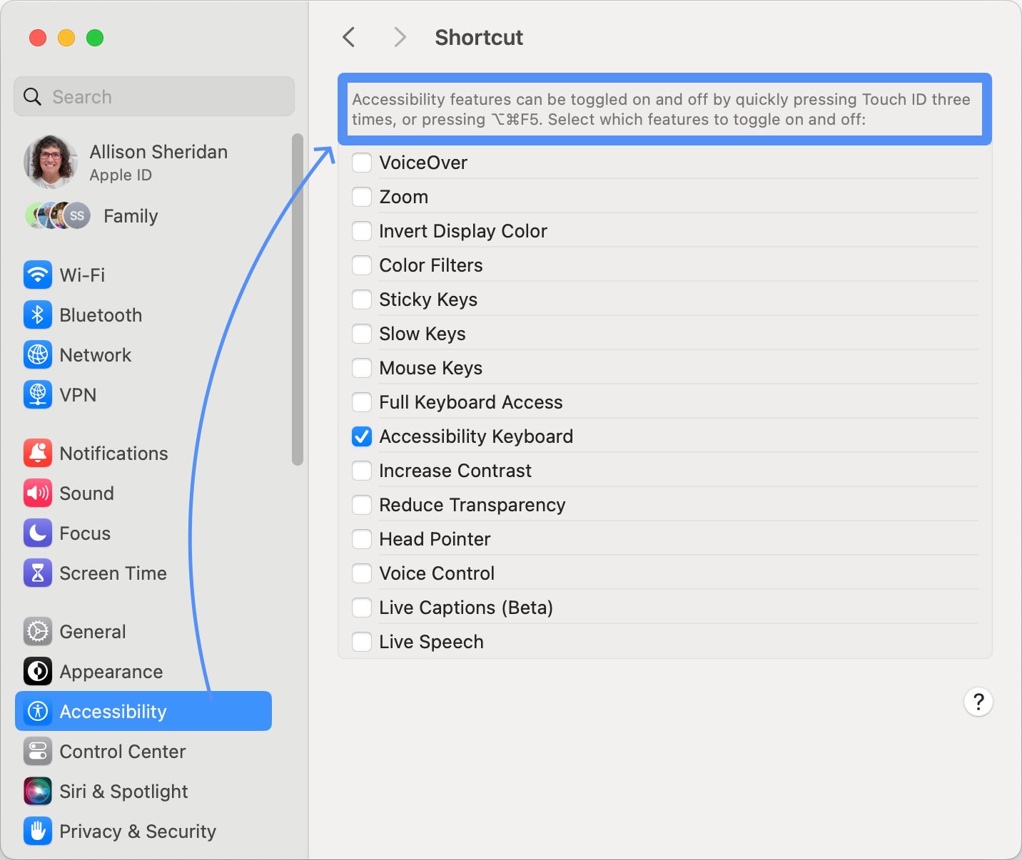 - If you want to change the shortcut, go to System Settings → Keyboard → Shortcuts and select Accessibility on the left