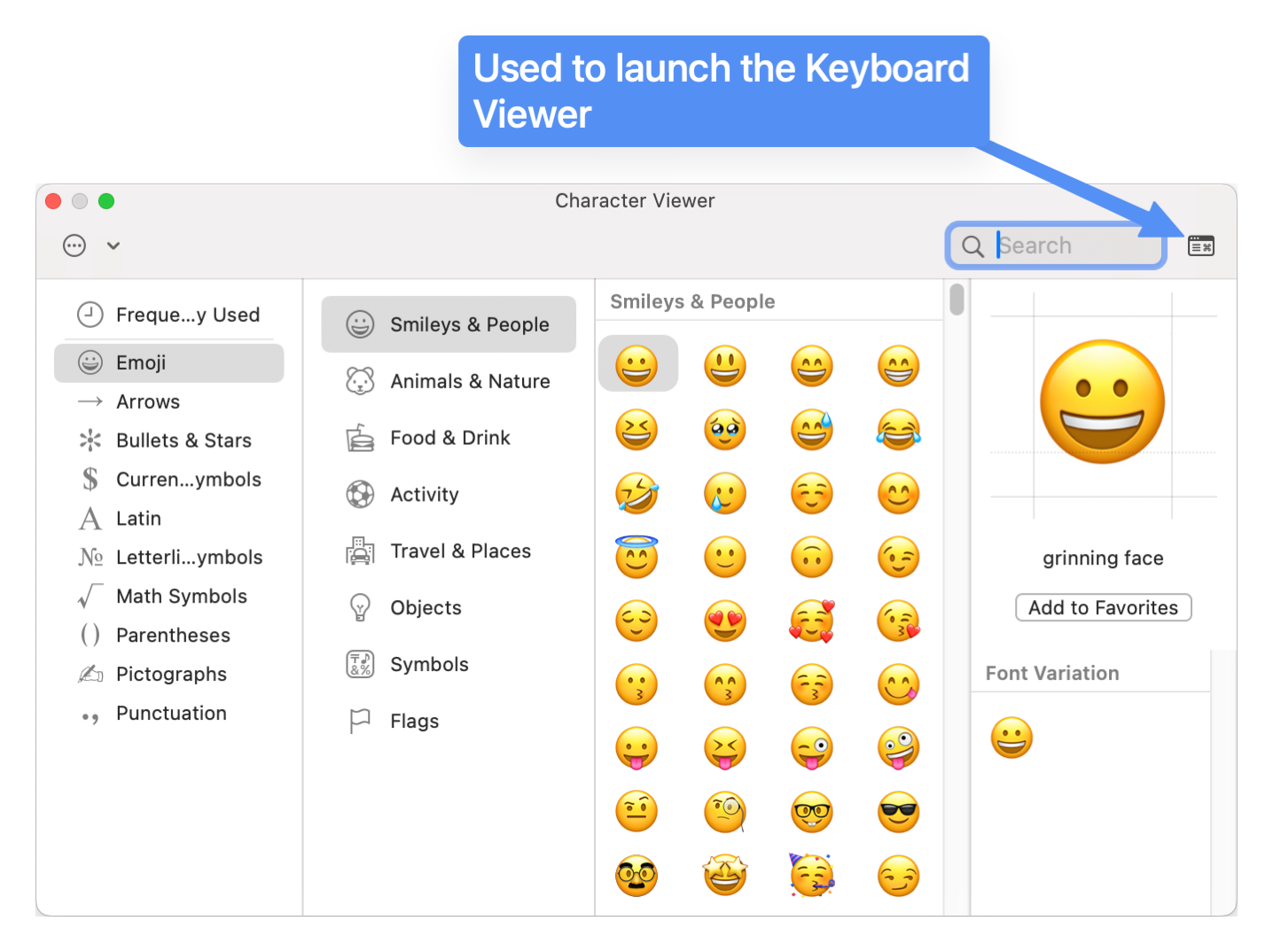 I mentioned earlier that it used to be a lot easier to launch the Keyboard Viewer. In macOS we have a pane called the Character Viewer that you can launch by tapping the Globe icon on your keyboard. It might come up with just an emoji, but you can see the full set of emoji and symbols by tapping the icon in the upper right … which looks exactly like the Input Sources icon we just enabled in the menu bar. It now simply does this toggle back and forth between just emoji and emoji and symbols, but in the old days, that icon would open the Keyboard Viewer. It’s fascinating to me that they still use the same icon but have two meanings for this icon.
