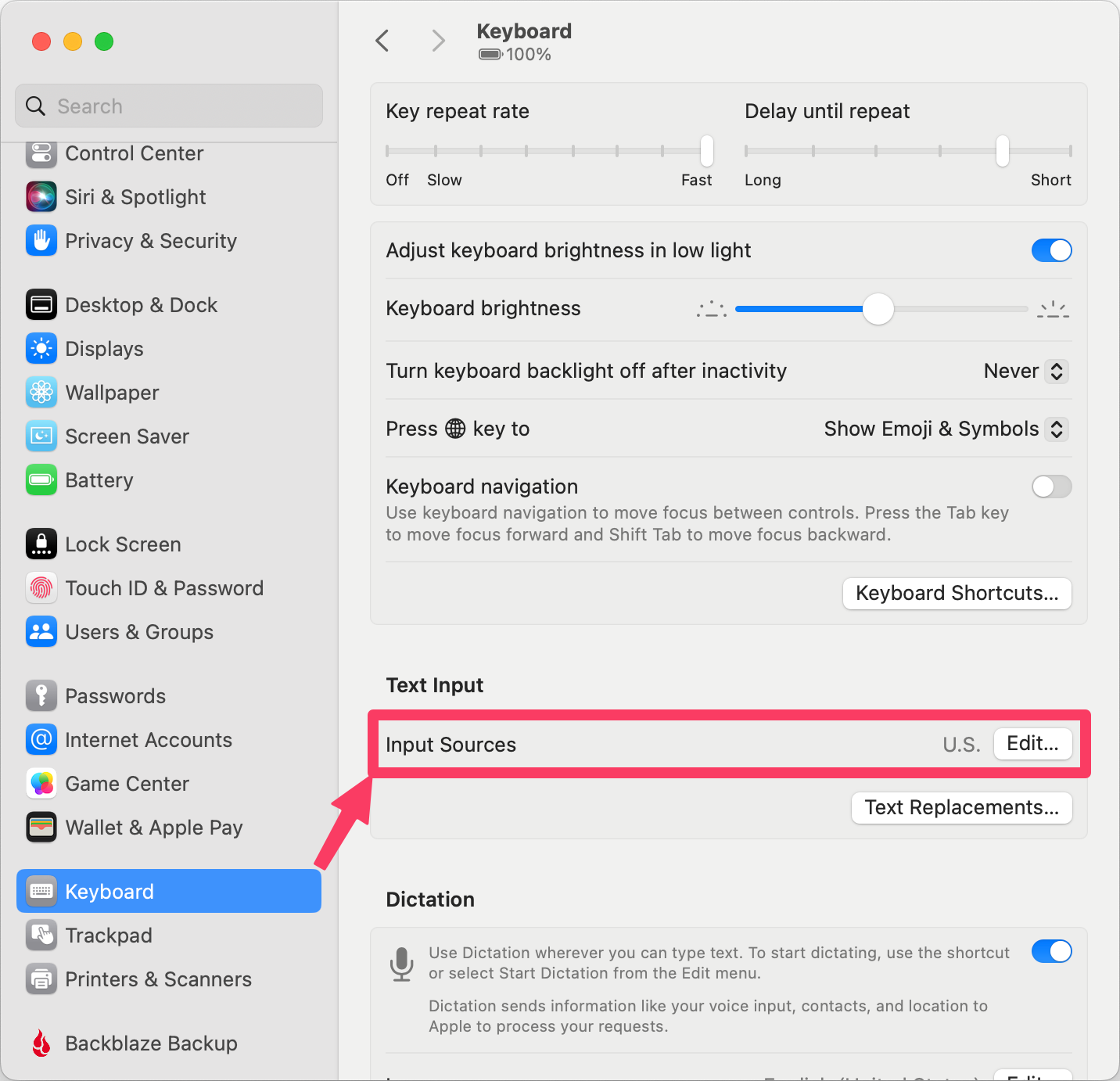 The only way to get to Keyboard Viewer is if first you show what’s called “Input Sources” in the menu bar. To enable this feature, open System Settings, and select Keyboard on the left. You should see under Text Input a line that says Input Sources. To the right of that, it will show in grey letters the language you’ve chosen, for example, DE for German. In my case it says U.S. To the right of that, there’s an Edit button. This is really unintuitive because I don’t want to edit the input source, but that’s where Apple has chosen to play this particular round of their little scavenger hunt.