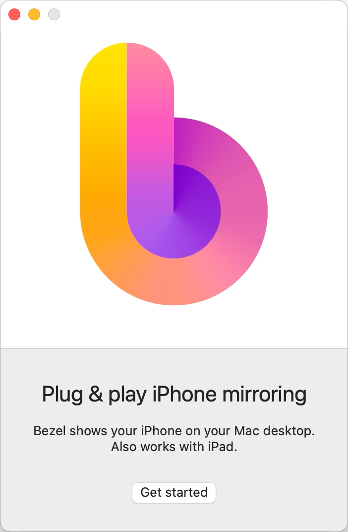 Let’s walk through the initial setup first which you only have to do once. When you launch Bezel for the first time, you’ll see a screen that invites you to get started doing plug and play iPhone mirroring.