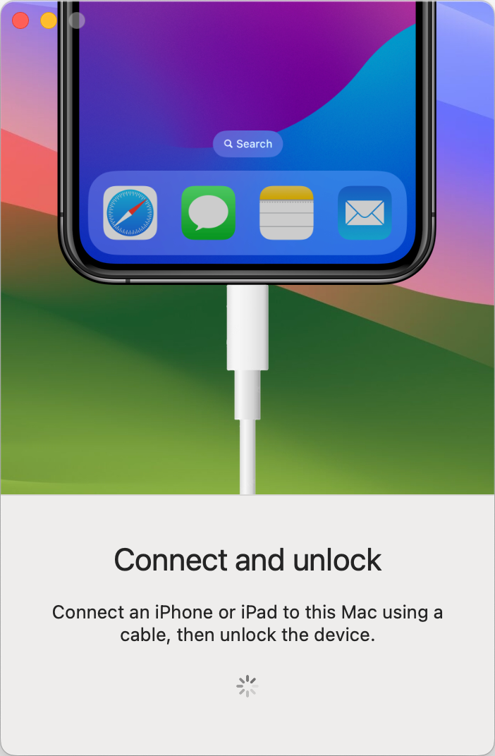 When you tap the Get Started button you’ll see a screen that says Connect and unlock. It shows a graphic of a cable connecting to a phone if that’s not obvious enough and the smaller text tells you to connect an iPhone or iPad using a cable, and then to make sure you unlock the device.