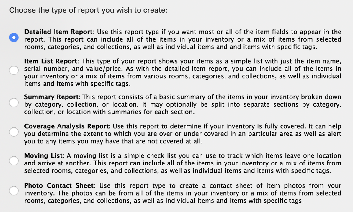 - Coverage Analysis Report – This is the one I mentioned that you get as much out of as you put into it. If you put the line items from your policies in detail into Home Inventory, then the Coverage Analysis Report will sum it up nicely for you. But if you just dump a PDF of your policy in there, this report won’t tell you anything.