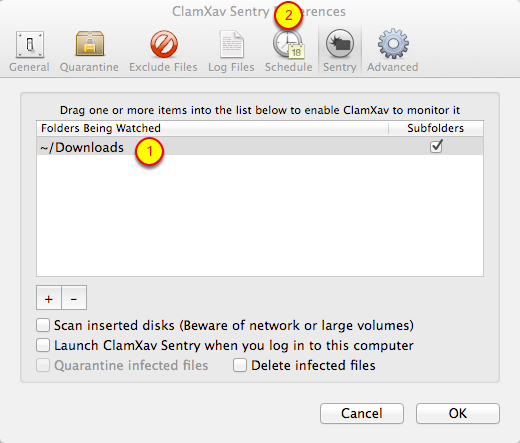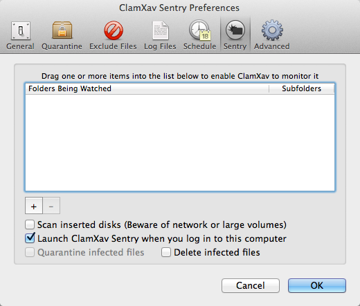 Sentry keeps an eye on any folder you choose.  We’re going to set it to watch your Downloads folder, because that’s where new stuff shows up that we want scanned.  This is the feature you only get if you buy directly from ClamXav.com and is not available in the Mac App Store version.
