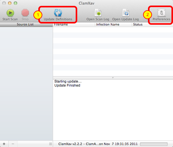 When you first launch ClamXav it’s a good idea to update the Virus Definitions.  Next let’s set some preferences.