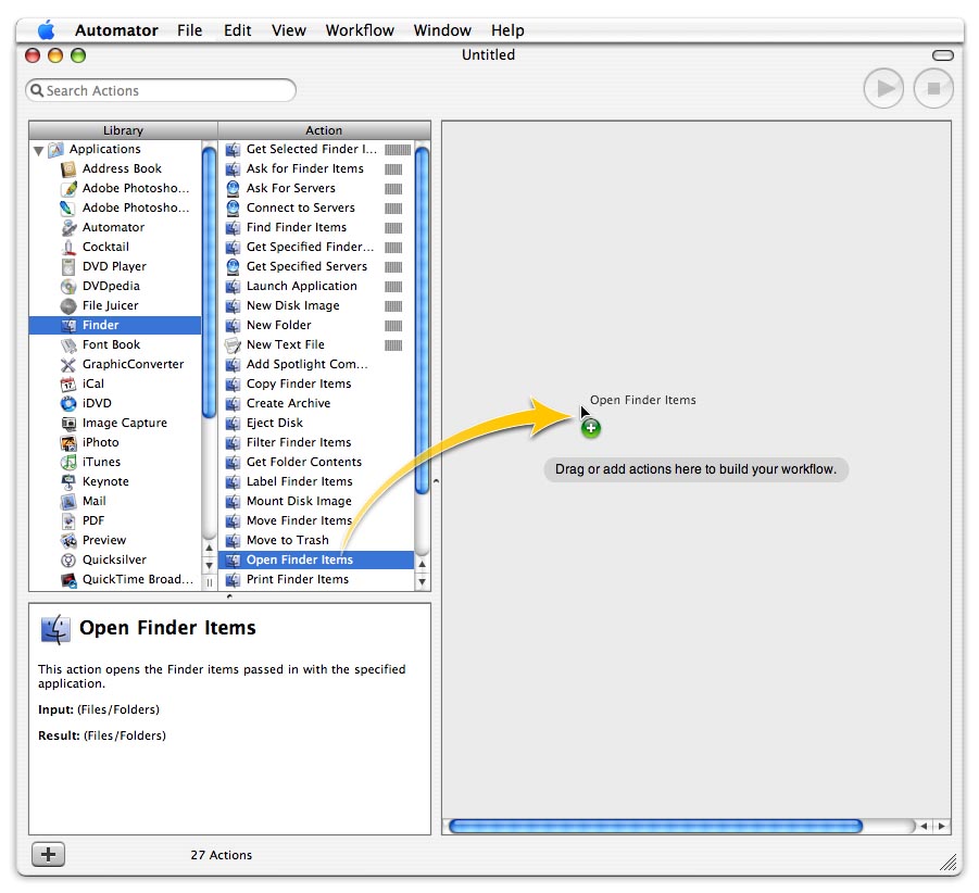 Under the "Action" column, drag "Open Finder Items" over to the workflow pane on the right(Pic 1).