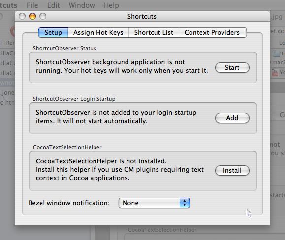 Click the "Setup" Tab and click the three buttons labeled "Start", "Add", and "Install". This will Start the ShortcutObserver so your shortcut will work in this session, Add the ShortcutObserver to your login startup items so your shortcut will work every time you login, and Install the CocoaTextSelectionHelper which assists in text selection (Pic 5a).