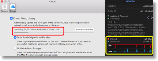 Unfortunately Alex handed me off to an advisor I can only call Charles. Charles was no help at all. Evidently he wasn’t the advisor who suggested moving rather than copying the library, and he said that the other advisor was wrong about that. He tried to convince me that the photos were not going up a second time. I showed him the iCloud window showing status that said, “Uploading 61,485 items (4.39GB of 325.73GB)”. I showed him the graph in iStat Menus for my network that showed lots and lots of spikes of traffic that coincided with the uploads shown by iCloud.