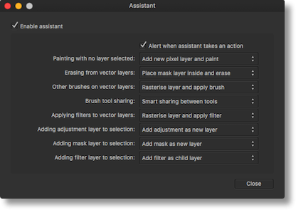The next button is for the Assistant and this little button looks like a butler’s uniform. I love the Assistant. Its job is to help prevent you from doing dumb things. Here’s a perfect example of something dumb we ALL have done. You want to paint on an image and you forget to create a layer first. The Assistant gives you options of what it will do. You can have it create a layer for you knowing you just forgot, or do nothing. You can also have it alert you to your mistake to help you learn, or not alert you so you don’t have to worry about it. There are 8 things the Assistant can help you with but I won’t go through all of them. It’s very much worth investigating the options.