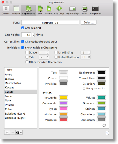 Next up is being able to control the font and background colors. A quick trip to CotEdit Preferences shows a plethora of settings that are actually easy to follow. In my experience, like with Atom, the preferences are arcane and not very clear, but CotEditor is laid our really well. For example, under Appearance, you can set the default font, size and color, the line height and whether to highlight the current line. You can choose from a variety of built in themes, change the default colors of those themes, and even create your own themes.
