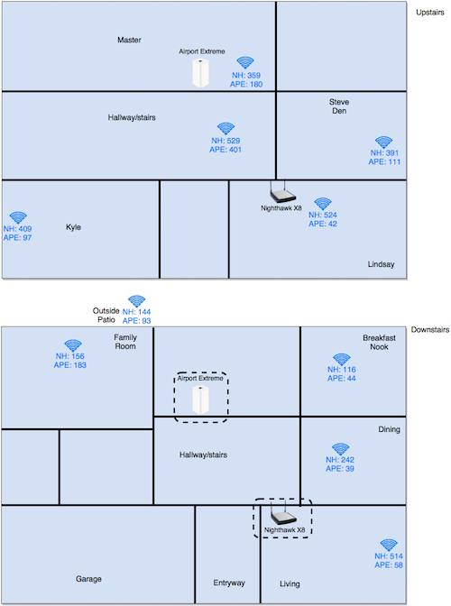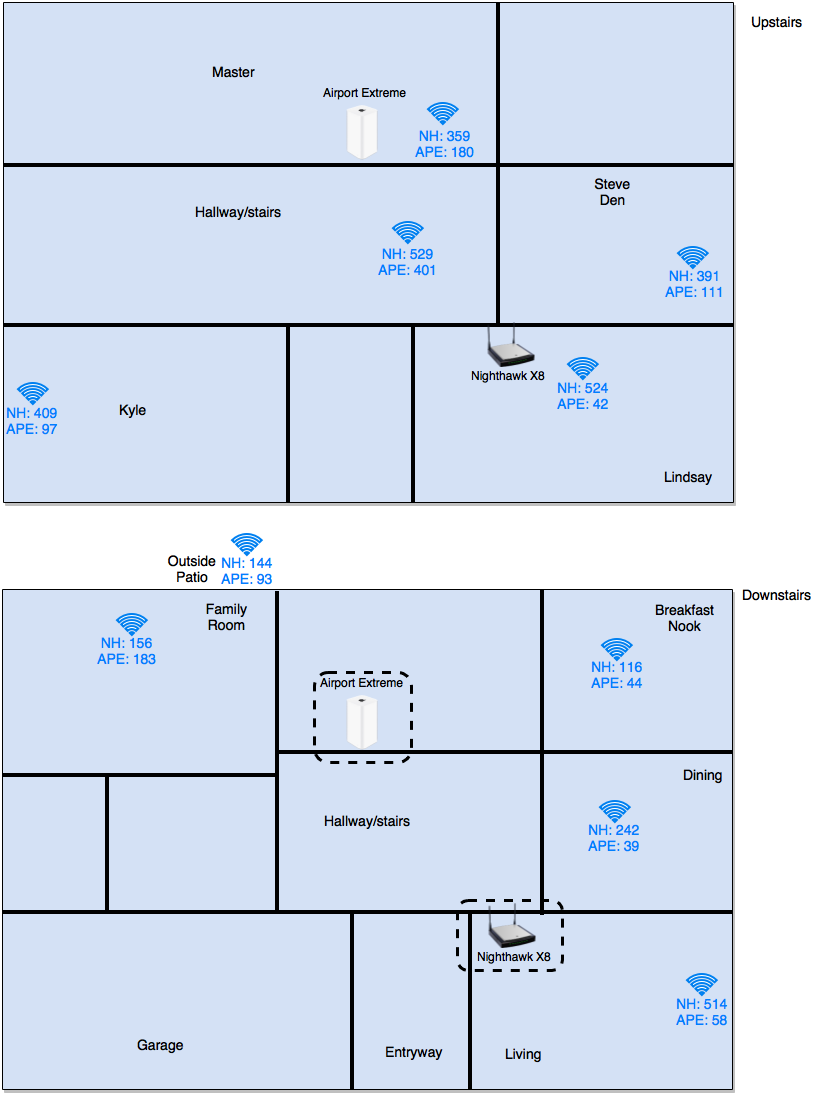 In each location where I took a measurement, I’ve shown the speed in Mbps with a little WiFi symbol above them. NH is the Netgear Nighthawk X8, and APE is the Airport Extreme. While the two routers are physically located upstairs as shown, for reference I’ve also shown their location on the lower floor with a dotted line around each so you can ponder what affect the router’s location might have had on the measurements through the floor AND the walls.