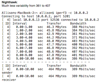 The only way to do reduce these variables was to have the laptop be stationary and me sit as still as possible in one location, test one network, and then test the other network. Well to do that, I couldn’t very well be dashing back and forth and moving my arms around to type the results. Steve became my able assistant to sit at the iperf server and swap out the Ethernet cable to switch routers.