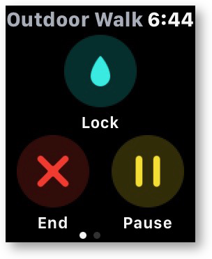 Water dropletOf course Apple thought of something better. When you start a swimming workout, your watch will automatically go into what they call water lock mode. You’l see a blue water droplet at the top of the screen. If you’re going to go outside in the rain, you can manually turn on the water lock mode. You can swipe up from the bottom of the screen and tap the blue water droplet, or swipe from left to right to the pause/stop screen to set the water lock button.