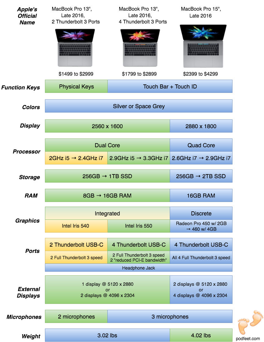 While the name is clumsy, you can actually pick up a Late 2016 13″ MacBook Pro and tell them apart simply by counting the Thunderbolt 3 ports. But for our diagram we need to understand all of the differences.