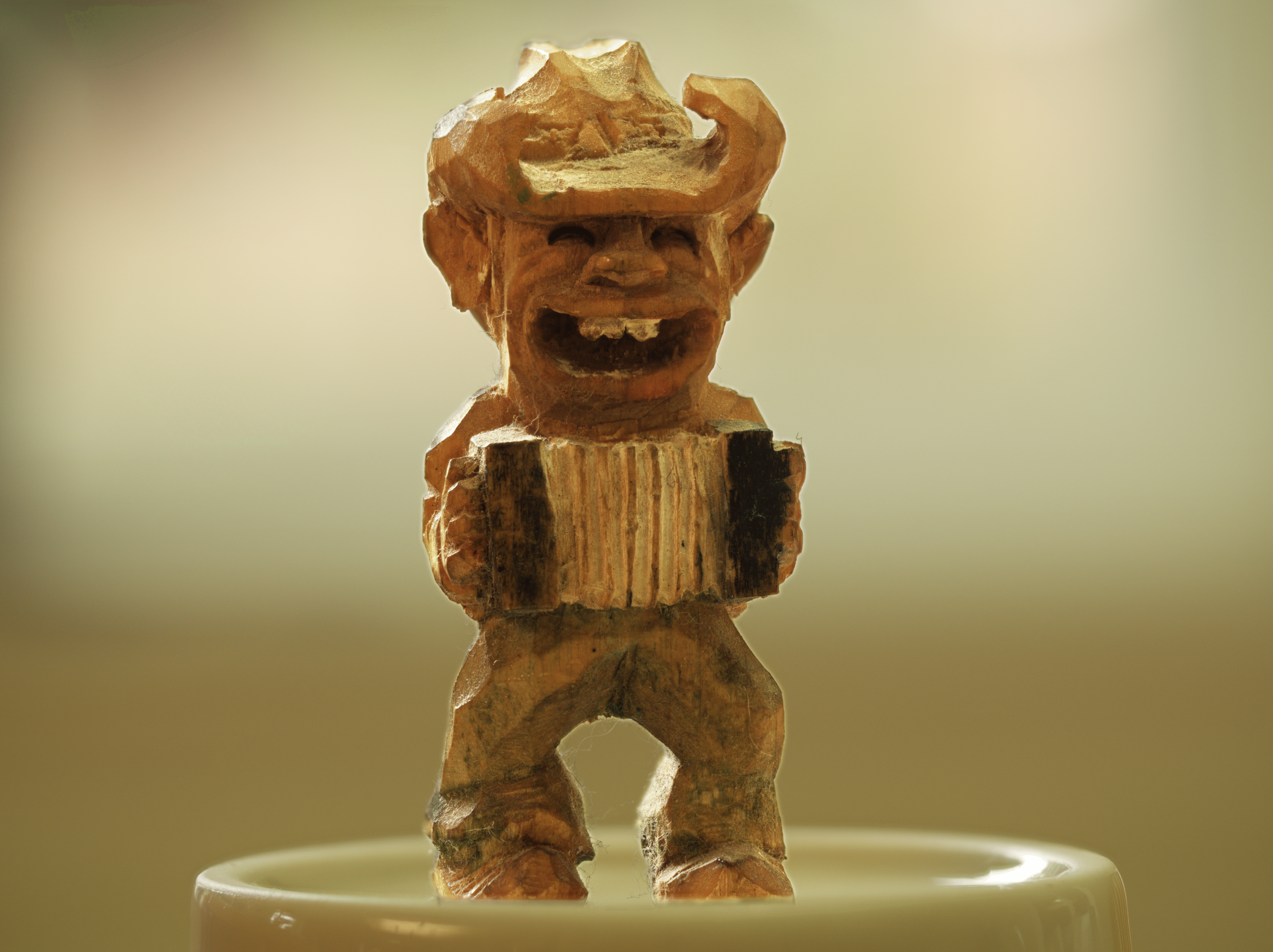 I decided to give it a try. My dad was a wood carver with a great imagination. Some of his pieces are beautiful, but my favorites are the weird, kind of creepy ones. The most interesting one I have is a tiny little farmer guy who is only about an inch and a half tall. He’s got on a cowboy hat with a big brim, for some reason he’s playing an accordion, and he’s got super creepy toothy grin. He’s spectacular. I thought he’d make a good subject for testing out focus stacking.