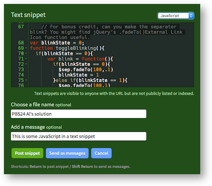 Along with the file uploads in the web version, you can also post what they call a Text Snippet. I’m not sure why this is such a specific thing, but I figured out I could actually post formatted JavaScript into the Text Snippet area. Not sure I need this but since I’m a big ol’ JavaScript master now, it was cool.