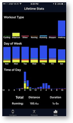 The third tab over shows you lifetime stats since you started tracking workouts with your Apple Watch. It’s not something you need to view every day but it’s fun to see a bar graph showing how much of your workouts have been cycling, elliptical, rowing, etc, and stacked bar charts by day of the week (evidently I slack off on Wednesdays). You can see the time of day (I’m a machine at 8am and again at 4pm).