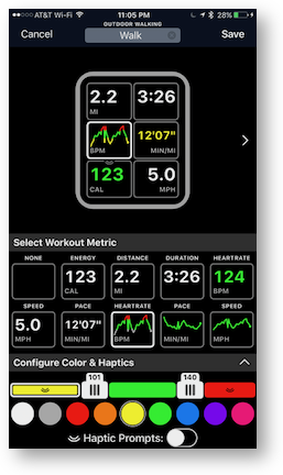 Not only do you get to configure what metrics you see, you get to set their colors. I like the beats per minute to be red, you know, like a heart, and the calories green because most of the time I’m trying to get to a calorie goal so I want to that to jump out at me. You’ve got 9 colors to choose from so you can really make this garish if you like!
