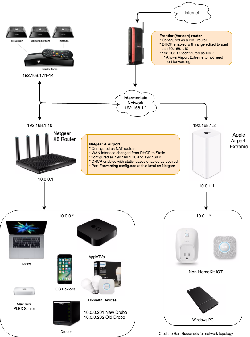 The Netgear router creates its network in the IP range of 10.0.0.x. Inside that network we have our Macs, including our Mac mini PLEX server, our Apple TVs, our iOS Devices, our Drobos (network attached storage) and finally any HomeKit-compatible IoT devices. We actively decided to trust HomeKit devices inside the same network with our most private data.