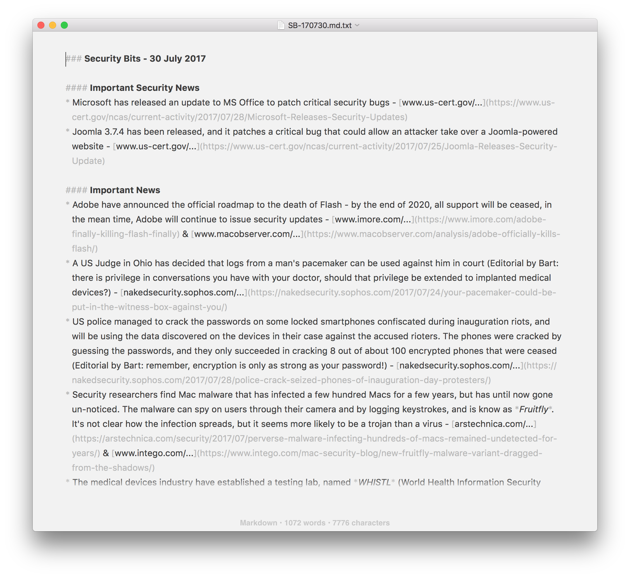The markdown experience was OK for long-form text, because long-form text in Markedown is 95% text with just the odd markup character here or there, but, show notes for things like Security Bits and Let’s Talk Apple are very different to long-form text. They are almost all markup, because it’s link after link after link. What you get with content like that in an editor without any kind of syntax highlighting is a confusing mess on screen!
