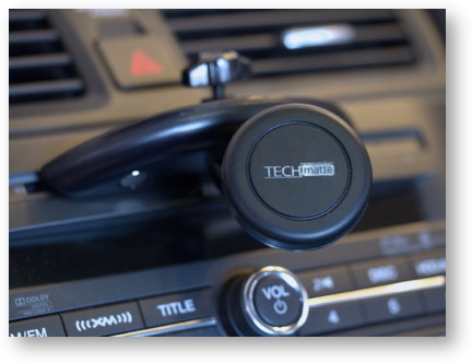 I’ll explain how to set the TechMatte up, but first let me describe how it works in action. The TechMatte has a big round magnet on a swivel. You put the small, provided steel plate inside your phone case, and then simply set your phone on the magnet. This magnet is strong enough to hold your phone securely while driving, and yet trivially easy to pull your phone off with one hand. It’s positively brilliant.
