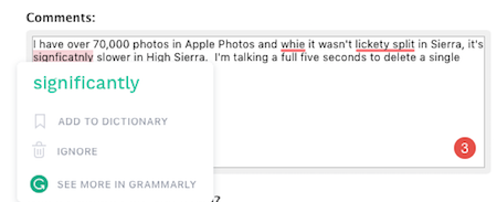 So far it sounds like any operating system’s built-in spell checker. But with Grammarly you don’t have to click on anything, just hover over any of the red lines and Grammarly will tell you what she thinks you did wrong. Misspelled words are pretty obvious. You can click on the correct spelling to fix the mistake. You can also choose ignore if you think (or know) she’s wrong. But you might have an odd word that you want to add to the dictionary. If you choose that option, you’ll be prompted to create a login to Grammarly.