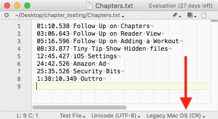 She explained to me that the text file exported from Hindenburg did not have unix line feeds at the end of each line, instead it had legacy macOS carriage returns. She discovered this by opening the file in BBEdit and looking at the bottom of the window. First of all, I didn’t even know that was a THING, and second of all, I never would have thought to look at that teeny little indicator in BBEdit, even if I had opened the file in that particular editor!
