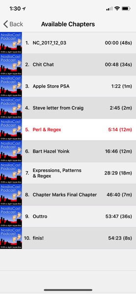 In Downcast there’s a little bookmark symbol, and tapping on that in all versions of Downcast reveals the chapters in a podcast. On the timeline, you’ll see little tick marks indicating chapter marks. The fast forward and back icons have vertical lines on them, which means you can use them to jump from chapter to chapter.