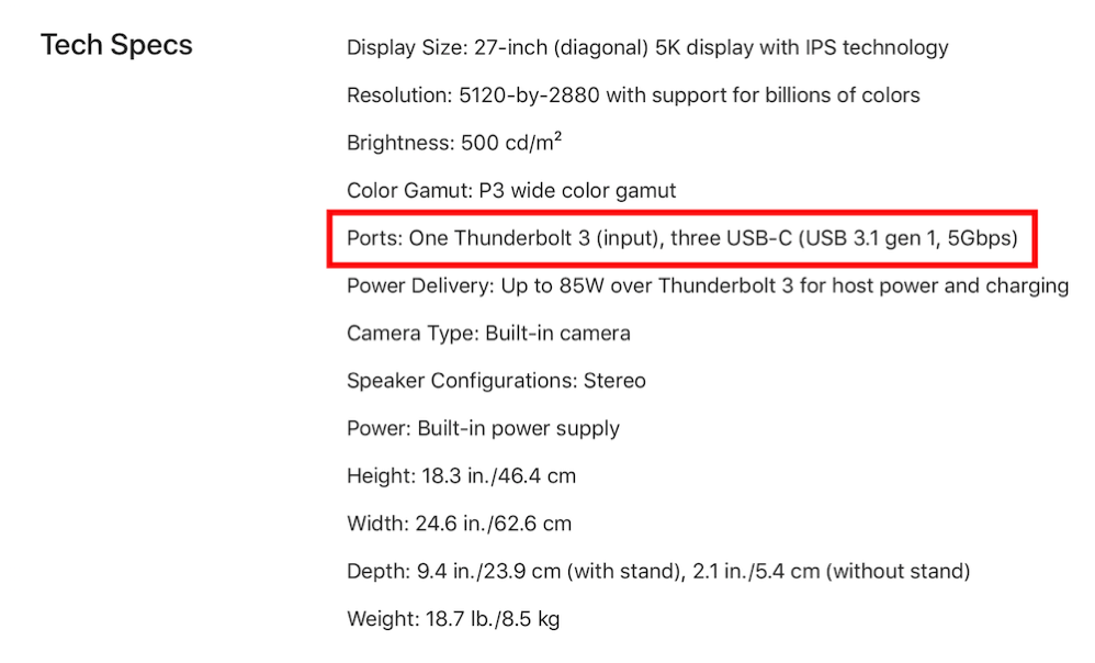 I looked at the tech specs online at Apple, and I saw something interesting. It said, “Ports: One Thunderbolt 3 (input), three USB-C (USB 3.1 gen 1, 5Gbps)”. That’s interesting in two ways. It says “input” so my assumption about the white oval outline on that one port, but it also says that only that port is Thunderbolt 3, while the other three are only USB 3.1 gen 1. That means just that one input port can carry the DisplayPort signal.