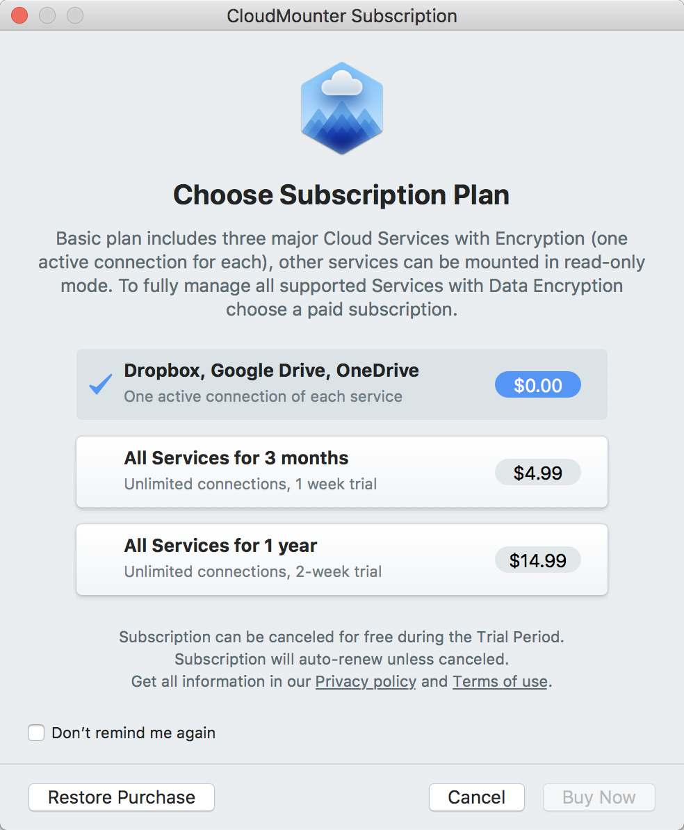 CloudMounter Subscription  EncryptionIf you want the full functionality, including multiple connections to Dropbox, Google Drive and OneDrive, plus the more advanced connections like SFTP and Amazon S3 and Backblaze, you have to options. You can buy a license for $30 from the website and optionally have a lifetime upgrade guarantee for $15 more. Any upgrades they make in the future are yours. I’ve never seen a lifetime upgrade guarantee before and I think it’s a great idea.