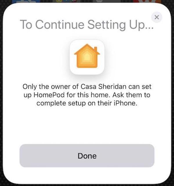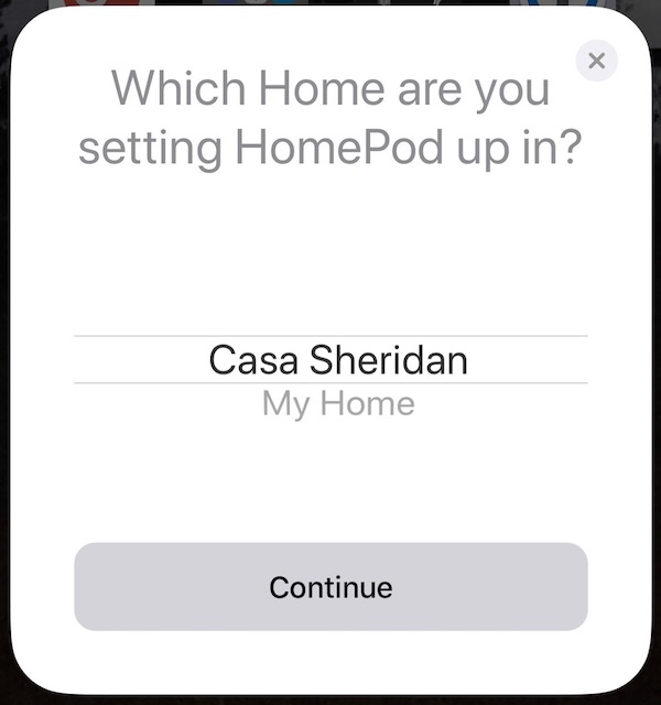 We plugged in HomePod and waited to see what it would do (not reading any instructions of course). Steve was standing near it and his iPhone came up with a screen suggesting he start setting it up. But as he proceeded into the steps, it told him that only the owner of our Home could set it up. I was the one who set up HomeKit and therefore I’m evidently the owner of our Home, which means only I can set up HomePod. This was surprising, and disappointing.