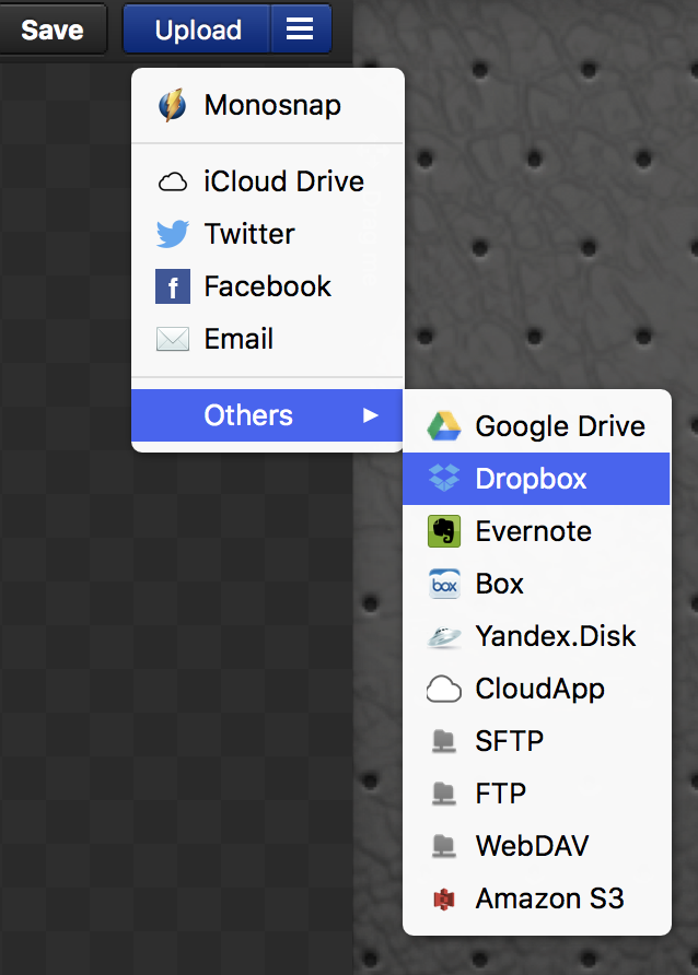 Nowadays, we often like to save to cloud storage. With Monosnap you can save to Monosnap’s server, or save it right to iCloud Drive. Or you can Tweet, Facebook, or Email it right from the main window. Not enough options? How about SFTP or FTP to your own server? Or maybe you want to send it to a webDAV server? Or how about Amazon S3?