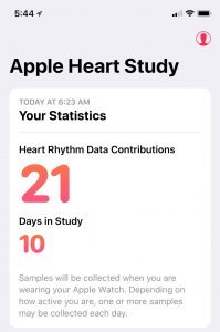 It’s important to note that the Heart Study app does NOT provide you data on your heart health or heart rhythm unless it detects a problem. Only if a problem is detected will you get feedback in the form of a notification and an offer to consult with a doctor. The app’s primary purpose is to feed your heart rhythm data into Stanford’s statistical database, not to give you real-time feedback on your heart condition. The only data the app provides you on a continual basis is the number of times it has contributed your rhythm data to the study and the number of days you’ve participated in the study.