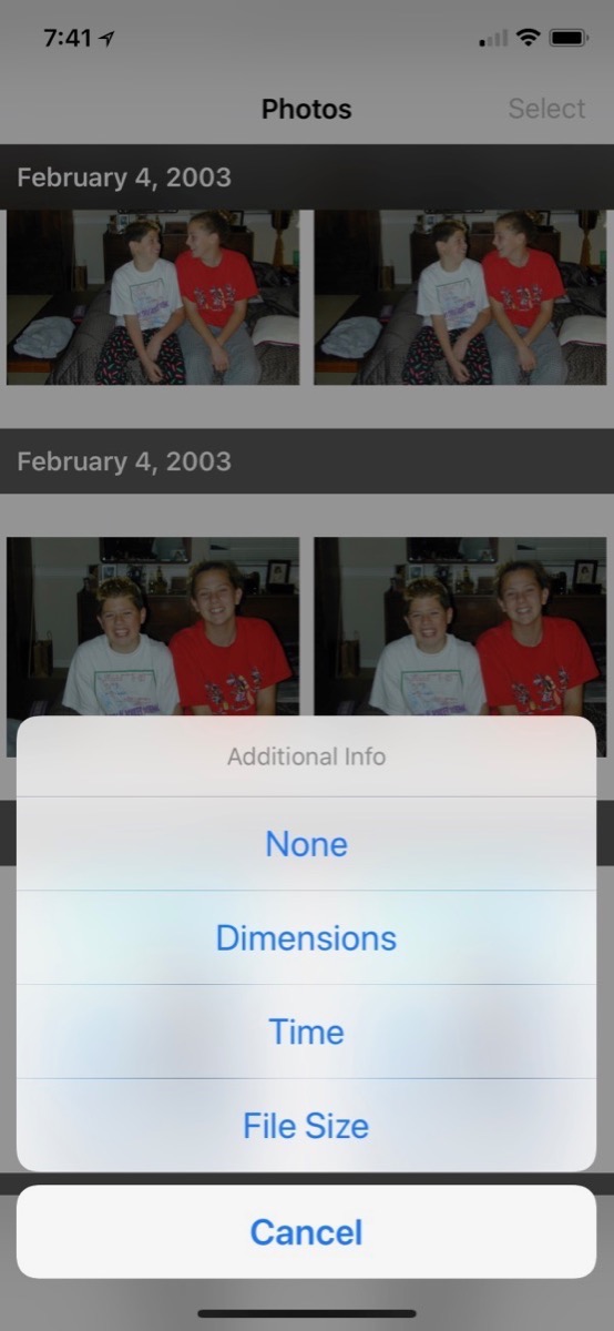 HashPhotos has some really advanced features too. One of my favorites is that it will help you clean up duplicates and find similar photos. You would think that with a library of 70K+ images, checking for duplicates would take a really long time, but that’s the beauty of HashPhotos: it’s FAST. It took 37 seconds to find 273 duplicates. In the viewer on even the smallish iPhone X screen, you can easily see that the images it found are indeed duplicates. But if you want to check to be 100% certain, you can choose to see the dimensions of the images, the time they were taken, or the file size. I wish I could see all three metrics at the same time but it’s super fast to flip between them so it’s still really helpful.