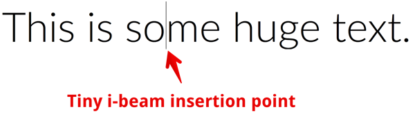But there was a big problem. Picture a 300-person auditorium and trying to see my little cursor moving around in text on the big screen. I know a lot of accessibility tricks, like how to make the cursor huge, but there’s one thing you can’t make bigger, and that’s the I-beam blinking cursor that I’m moving around in text.