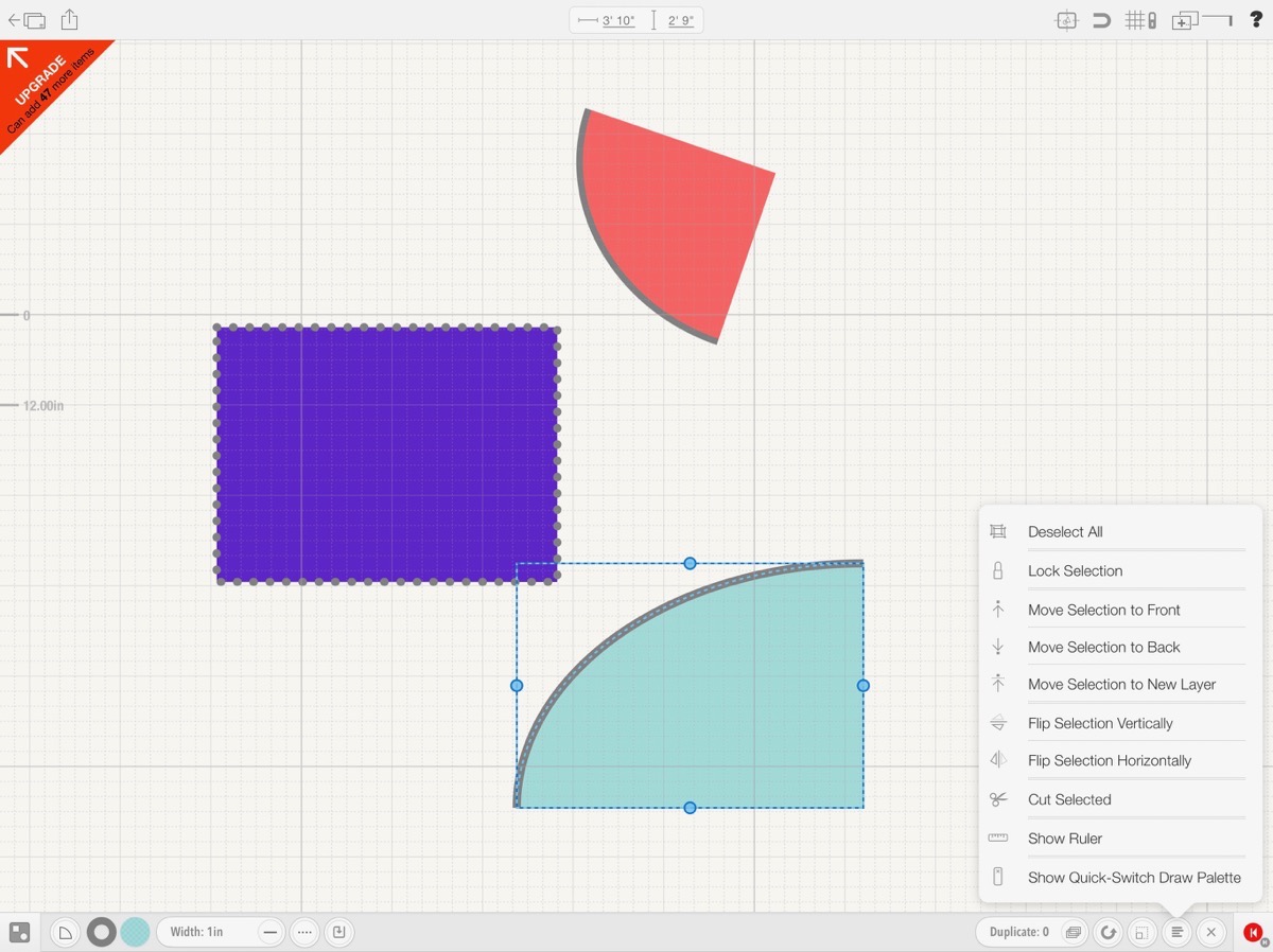 With a shape or shapes selected, the bottom right will give you more things to do with the objects you’re creating. There’s a handy duplicate button which came in handy for me when I drew my first side table and wanted another one. The next icon is an arrow in a circle, which I assumed was undo, but instead it’s a rotate button. This will give the selected object(s) a center point and a rotate angle that you move with your finger or stylus. Very intuitive use of the touch interface.